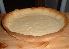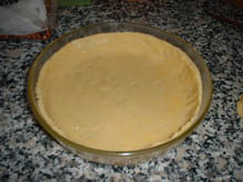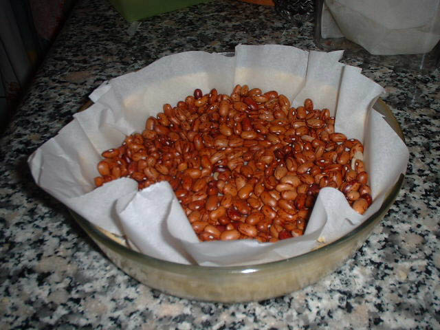 Foderare con il disco di pasta una teglia da forno ben imburrata, tagliare la parte eccedente con una rotella tagliapasta (o un coltello bene affilato) e bucherellare la pasta con una forchetta. Ricoprire la pasta con un foglio di carta forno e riempire la teglia di fagioli secchi (che possono essere conservati e riutilizzati in un'occasione simile). Infornare in forno già caldo per circa trenta minuti a 180-200 gradi. |