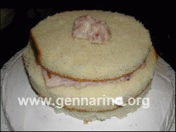 1)Preparate la base per della bambola il pan di spagna tondo dividetelo in 2, bagnatelo con lo sciroppo di acqua e zucchero, in questo caso non sono stati aggiunti liquori, perche' e' una torta per bambini e imbottitelo con la crema pasticciera, melina ha mischiato alla crema della marmellata di ciliegia fatta in casa, ed infine copritela con la panna montata. 2) Dal pan di spagna quadrato ricavate 3 dischi che porrete, uno sull'altro, sulla torta utilizzata come base.