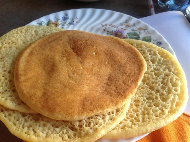 Non scrivo da tanto tempo che quasi nessuno si ricordera' di me... Vicissitudini familiari e di salute mi hanno tenuta lontana.Oggi pero' ho finalmente avuto una ricetta che cercavo da tempo e che vorrei condividere con voi. Si tratta di un pane cotto in padella; ha molte varianti, quella che vi posto e' quella da condire con burro e miele per la colazione o per accompagnare il the, possibilmente alla menta, ma varianti diverse, con farine e lievitazioni diverse, sono usate in molte parti dell'Africa come " supporto" per ogni cibo, nel senso stretto del termine, ovvero questo pane viene messo sul piatto e poi sopra vi viene posto il cibo. Somiglia piu' ad una crepe o ad un pancake che ad un pane, ma loro lo chiamano cosi....
