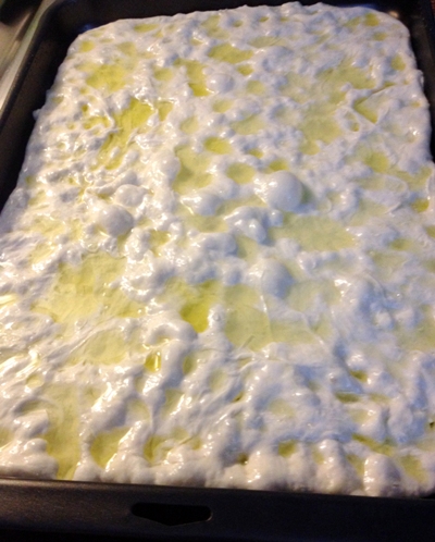 Non ho usato carta forno. La ricetta non indica che per stendere l’impasto fino a coprire la teglia, per non perdere l’aria inglobata, bisogna non solo operare molto delicatamente (anche qui: o con mani bagnate o unte d’olio: la ricetta non lo dice), ma a più riprese, lasciando l’impasto riposare 10-15 minuti tra un aggiustamento (in teglia) e il successivo.