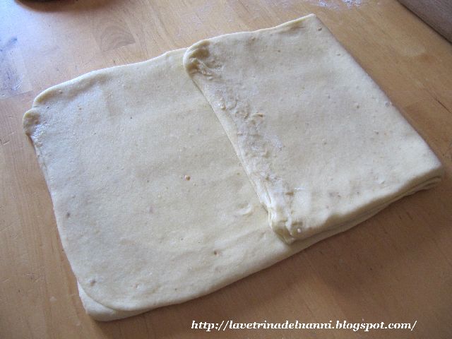 Ecco, questa è la piega a tre. La prima, almeno: per farne un'altra, si riparte ovviamente dalla schiacciata con il mattarello e si ripete la piegatura.