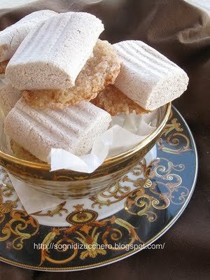 In effetti il guscio bianco di questi dolci ricorda molto una meringa anche se al gusto si capisce la consistenza poco zuccherina e la prevalenza di farina, anche la base caramellata e che si attacca ai denti ricorda vagamente il torrone e puo' portare in inganno facendo pensare alla presenza di mandorle.