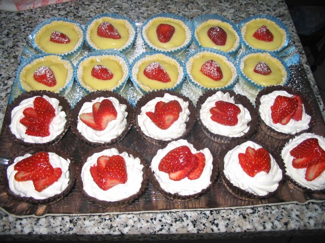 Poi mi sono detta: mi avanzerà sicuramente della panna e della crema, il cioccolato fondente ce l'ho, ho fatto un pò di pasta sablè, ho comprato le fragole, ed ecco che cosa ci è venuto fuori....crostatine con crema e fragole e pirottini di cioccolato con ciuffi di panna e fragola...mmmm...questi ultimi in particolare, una goduria...