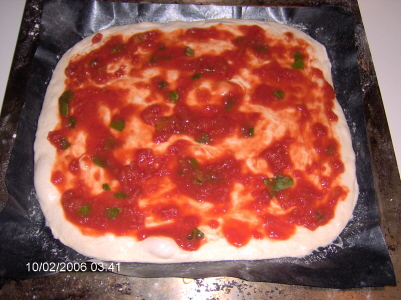 Cospargiamo delicatamente con polpa di pomodoro schiacciata lasciando non più di un dito di cornicione.