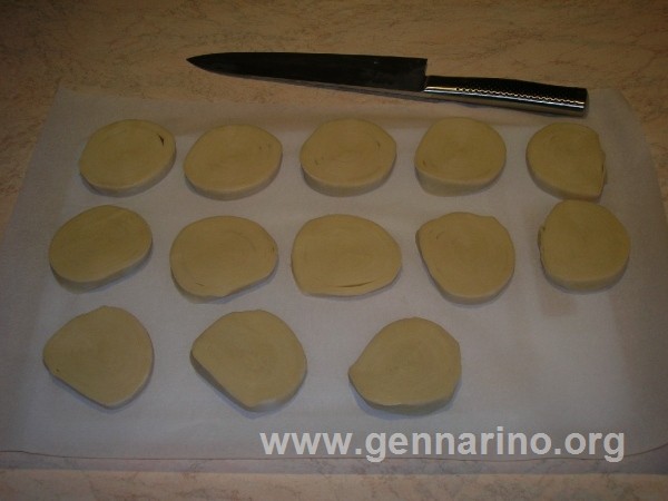 20. Una volta completato il riposo in frigo per 24 ore riprendere il rotolo e ricavare delle fette di un centimetro di spessore.