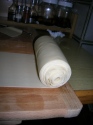 16. Tagliare l'eventuale punta della sfoglia e completare l'arrotolamento del nastro. Pareggiare i bordi, spennellare con lo strutto e chiudere nel cellophan per riporre in frigo per 24 ore.