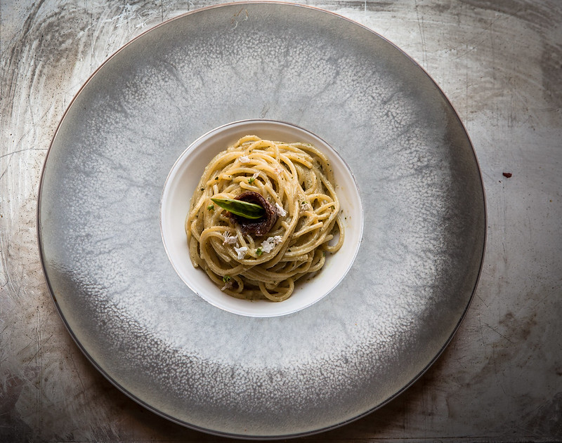 Unire colatura e olio: aggiungete la colatura di alici e l’olio extravergine d’oliva, frullando fino a ottenere una crema densa e omogenea.