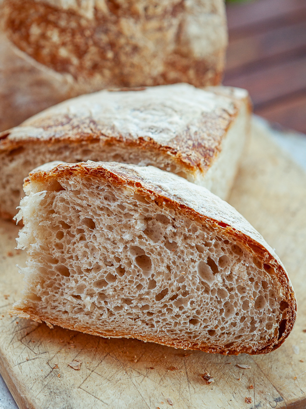 Non c’è una parte di farina aggiunta nell’impasto finale, come accade in molte ricette. L’impasto ha quindi il tempo di fermentare lentamente, sviluppando aromi più ricchi, una mollica più leggera e una crosta più saporita.