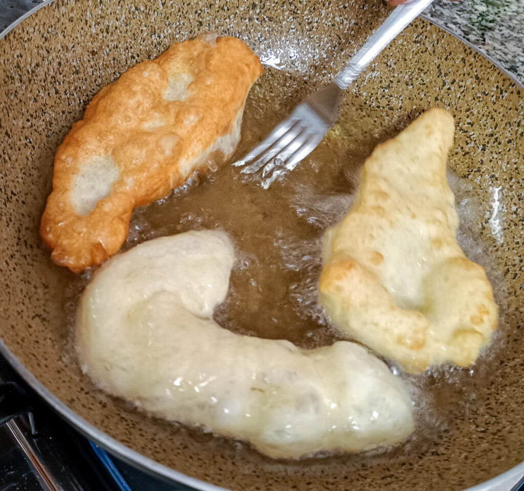 Tagliate delle pezzature di circa 50 gr, allargatele coi polpastrelli e friggete i torcini in abbondante olio caldo.